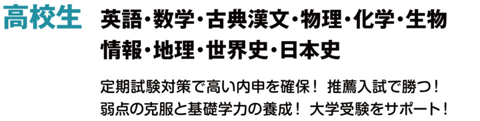 推薦入試、一般入試の大学別対策、共通テストなど、あらゆる形式の大学受験に対応できる授業と情報を提供します!君達が受けた全統模試のデータを活用し、適切な講座を案内します。映像授業×アドバイザーの力で、ひとつ上の現役合格!