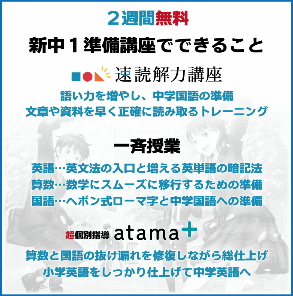 新中学1年生 準備講座 最新情報 2026.01.07 公立中学進学予定の中学1年生はもちろん、福知山高校附属中・京都共栄学園中に進学する生徒諸君も、ぜひ参加して下さい。詳しくは、お問い合わせ下さい。ピッタリの学習スタイルをご提案します。
